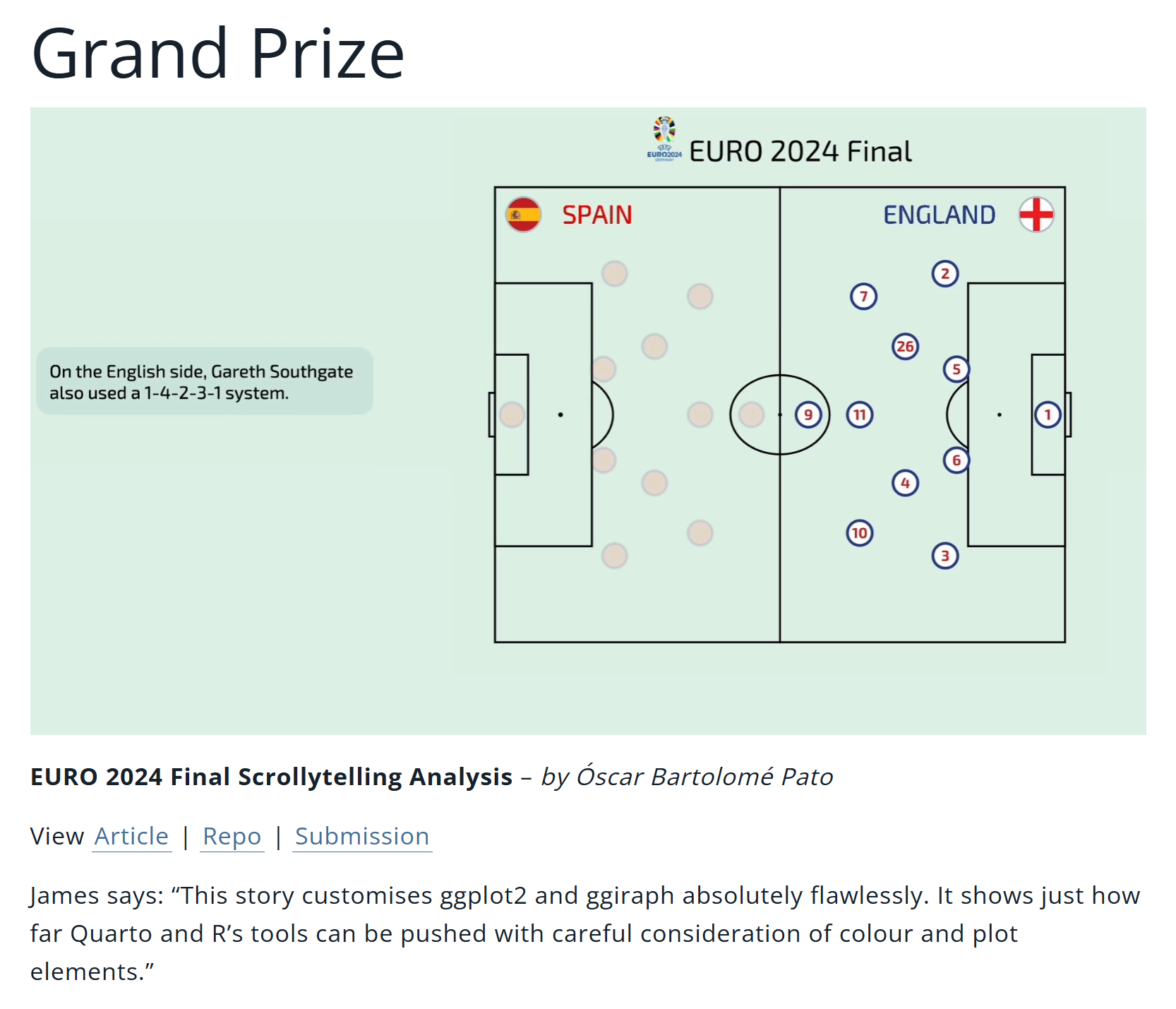 A visual analysis of the EURO 2024 Final using the scrollytelling technique, winner of the 2025 Posit Closeread Prize.